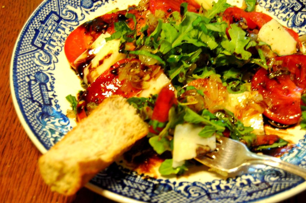 Caprese salads are pretty standard: mozzerella, fresh tomatoes, fresh basil, oil, and balsamic vinegar. Wham bam.