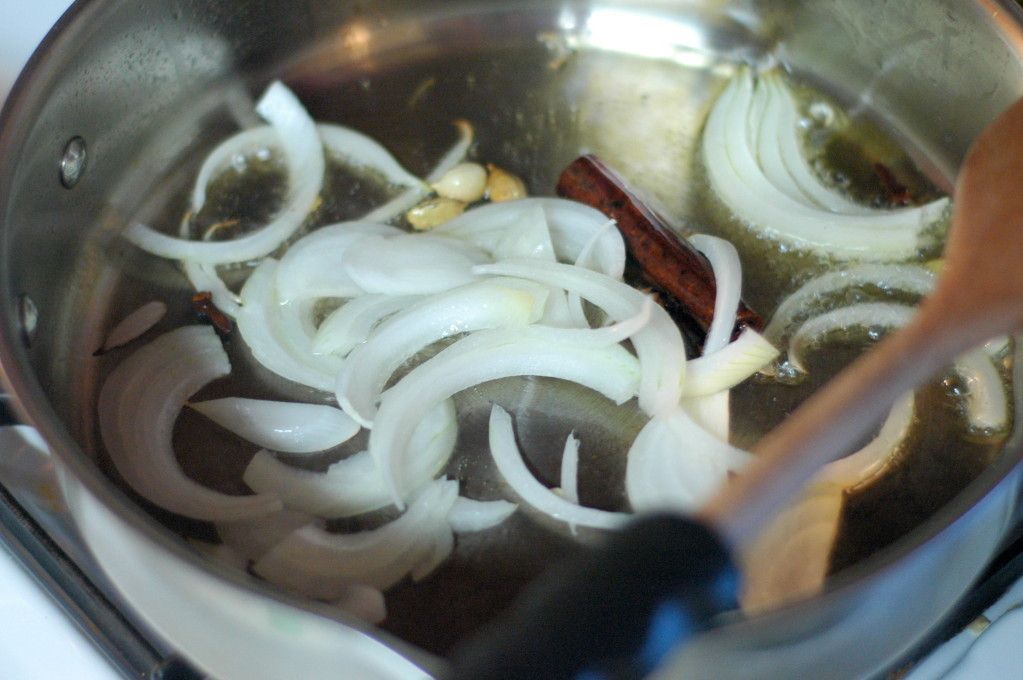 Step One: Heat the oil in a skillet. Add in the cinnamon stick, cardamom pods, and cloves until fragrant (30 seconds or so). Then, add in your slices onion and good for 3-4 minutes, or until it starts to colorize.