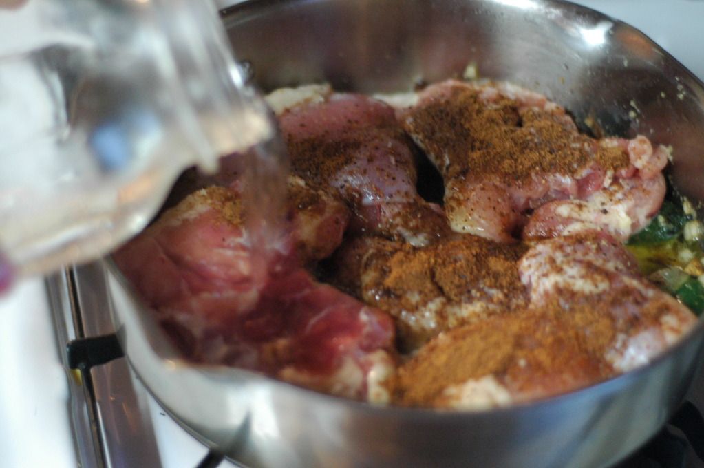 Step Three: Add in the chicken and allow it to hang out with the spices for a few minutes, giving it a chance to brown a bit. Sprinkle with the garam masala and add hot water to about half-way up the side of the chicken. Cover with a lid and allow to simmer for 10-12 minutes or until the chicken is completely cooked.